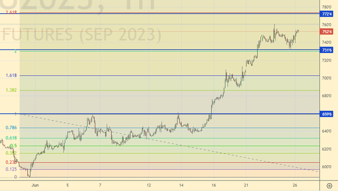Рынок продолжает отыгрывать обеспокоенность по поводу реальных объемов поставок из региона Черного моря, также проблемы с пшеницей в ЕС из-за засухи. Мы подошли к 750.0 и не исключено сможем достигнуть 770.0 чем можно воспользоваться для продаж.
