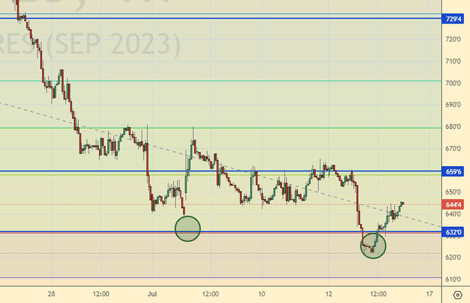 Покупка: нет. Кто в позиции от 620.0, перенесите стоп на 622.0. Цель: 700.0.