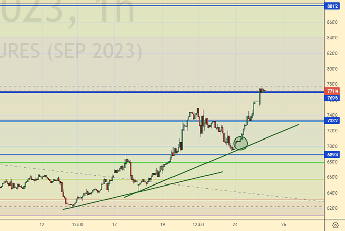 Покупка: нет. Кто в позиции от 700.0, перенесите стоп на 705.0. Цель: 880.0.