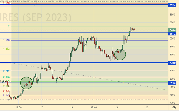 Весьма вероятно, что мы идем к 590.0. Хотелось бы получить больше понимания по поводу перспектив бесперебойной работы сухогрузов в Черноморском регионе, но этого пока произойти не может. Возникшее после отмены зерновой сделки напряжение будет поддерживать цены.