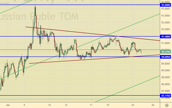 На рынке консолидация. Выход из неё вниз (ниже 90.00) приведет к ходу на 87.00, возможно 85.00. Отметим, информация о том, что системообразующие банки перестали, пока через банкоматы, принимать доллары и евро у населения не делает радужными перспективы обращения наличных денег «недружественных стран» на территории России.