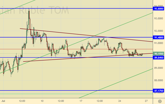 Пара продолжает находиться над 90.00, сохраняются перспективы для того, чтобы пройти выше: к 100.00. Если будут попытки уйти вниз, то можно или открываться в шорт или наращивать имеющиеся позиции. Внизу нас ждет 87.00 и 85.00.