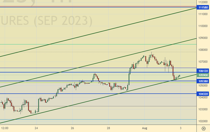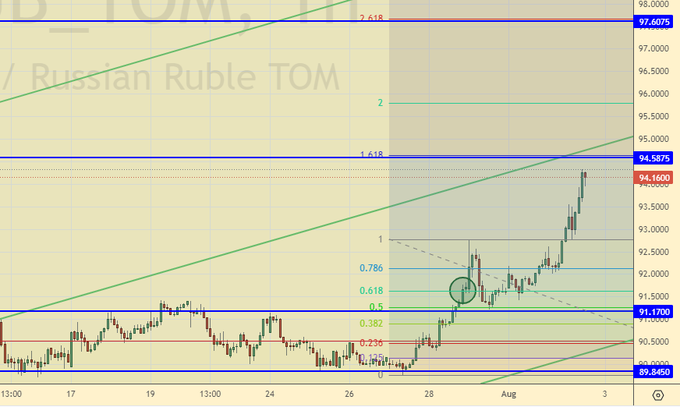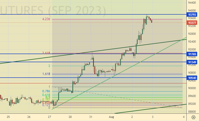 Не удается нормально войти в лонг. На сегодня возьмем паузу и посмотрим, что будет дальше. Скорее всего вообще никакого лонга не будет и нечего стараться. Российские акции перекуплены. Им надо остыть процентов на 20%, что должно нас привести к уровням по индексу РТС в районе 80000. Прямо с 10-го августа начнем.