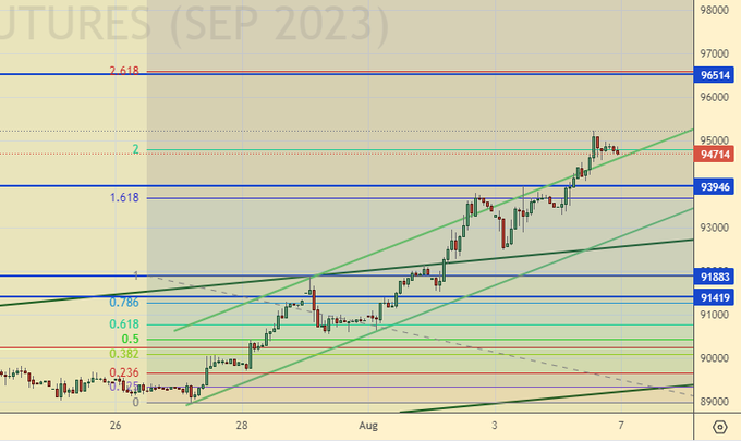 Отката нет. Мы продолжаем каждый день ставить новый локальный максимум. Здесь ничего придумывать не надо: держим открытые ранее лонги. Необходимость фиксации прибыли при подходе к 100.00 начинает вызывать сомнения.