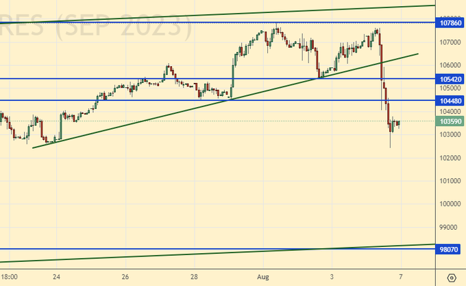 Стоп для шорта на 107700 уцелел, максимум был на 107620. Таким образом, мы в шортах. Если сегодня российский рынок отдаст, скажем, еще 4%, то это будет означать начало фиксации прибыли крупными игроками. Для инерционных инвесторов происходящее будет холодным душем. От расстройства они закроют позиции на фондовом рынке и пойдут покупать валюту.