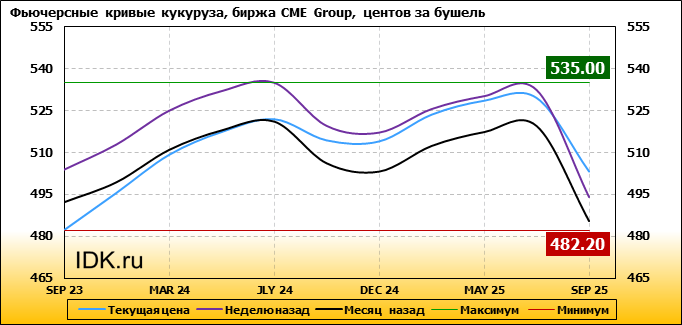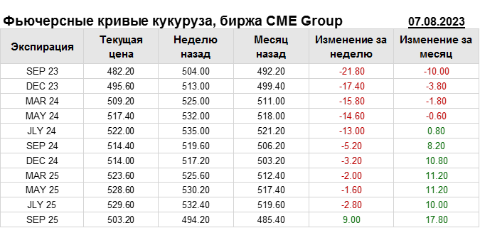 На 07.08.2023 стоимость кукурузы на бирже CME Group по контракту SEP 23 составила 482.2 цента за бушель. За прошедшую неделю стоимость кукурузы на площадке CME Group упала на 21.8 цента/бушель. Как мы видим на графике, фьючерсная кривая имеет периоды, когда более дальний фьючерс дешевле ближнего. Состояние бэквардации наблюдаем на следующих контрактах: SEP 24; DEC 24; SEP 25. Таким образом, трейдеры предполагают, что возможно превалирование предложения над спросом в указанные периоды.