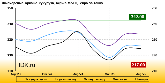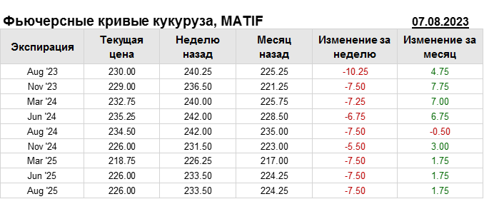 На 07.08.2023 стоимость кукурузы на бирже MATIF по контракту Aug ’23 составила 230 евро за тонну. За прошедшую неделю стоимость кукурузы на европейской площадке упала на 10.25 евро/тонна. Как мы видим на графике, фьючерсная кривая имеет периоды, когда более дальний фьючерс дешевле ближнего. Состояние бэквардации наблюдаем на следующих контрактах: Nov ’23; Aug ’24; Nov ’24; Mar ’25; Aug ’25. Таким образом, трейдеры предполагают, что возможно превалирование предложения над спросом в указанные периоды.