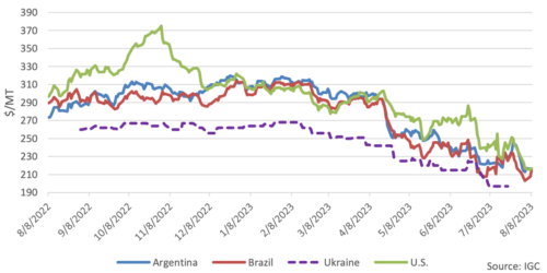 После июльского отчета WASDE ставки для всех основных экспортеров смягчились. Заявки США снизились на 23 доллара до 216 долларов за тонну из-за благоприятных погодных условий в июле для большинства районов выращивания кукурузы и субъективных оценок состояния посевов NASS. Бразильские ставки мало изменились с июля. Заявки Аргентины составили 216 долларов за тонну, что на 5 долларов меньше, чем в прошлом месяце. Конкуренция с большими урожаями в США и Бразилии и новый преференциальный обменный курс поддерживают более низкие цены. Украинские заявки не публиковались с 21 июля.