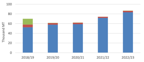 Рост импорта можно объяснить расширением тарифной квоты (TRQ) на ячмень. Расширение было осуществлено из-за опасений по поводу нехватки пшеницы и кукурузы в начале российского вторжения в Украину. Австралия, крупнейший поставщик Южной Кореи, также имеет большие экспортные поставки в этом году. Увеличение TRQ с 40 000 тонн до 250 000 тонн в 2022 году способствовало увеличению импорта ячменя в качестве заменителя кормов. В 2023 году TRQ установлен на уровне 100 000 тонн.