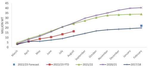 За первые 9 месяцев 2022/23 года Южная Корея побила предыдущие рекорды по импорту ячменя. Южная Корея импортировала 86 000 тонн ячменя в течение июня, побив рекорд 2021/22 года в более чем 74 000 тонн за полные 12 месяцев.