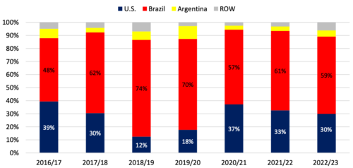 Соединенные Штаты восстанавливают некоторую долю рынка с 2019/20 года, но Бразилия продолжает доминировать