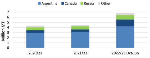 Поставки из США в апреле сократились, так как китайские покупатели воспользовались высоким урожаем бразильской сои и привлекательными ценами. Более мелкие поставщики сои в Китай также увеличили свой экспорт. Программа «соевого доллара» в Аргентине способствовала восстановлению отгрузок в первой половине 2022/23 года. Канада и Россия также увеличили экспорт в Китай в этом году за счет увеличения производства сои и относительно неизменного уровня дробления.