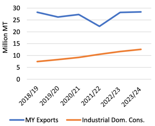 Рисунок 3. Экспорт и промышленное потребление пальмового масла в Индонезии