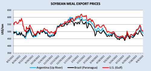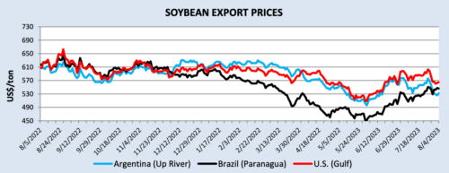 Хотя фундаментальные показатели были неоднозначными, цены на глобальный соевый комплекс в среднем выросли в июле по сравнению с предыдущим месяцем. Цены на сою в США в июле имели тенденцию к росту после более низких ожиданий урожая сои после отчета NASS о посевных площадях от 30 июня 2023 года в сочетании с высоким спросом на дробленую продукцию. Однако ближе к концу месяца цены начали снижаться на сообщениях об улучшении погодных условий на Среднем Западе США, при этом наиболее активный чикагский фьючерсный контракт на сою к началу августа потерял большую часть своего месячного положительного прироста. Хотя соевые бобы из США оставались самыми дорогими предложениями, ценовая надбавка к южноамериканским соевым бобам в июле сократилась. Аргентинская соя впервые с 2022 года начала торговаться ниже, чем бразильская, в начале августа, поскольку бразильская соя набрала силу благодаря сезонности и быстрому исчезновению.