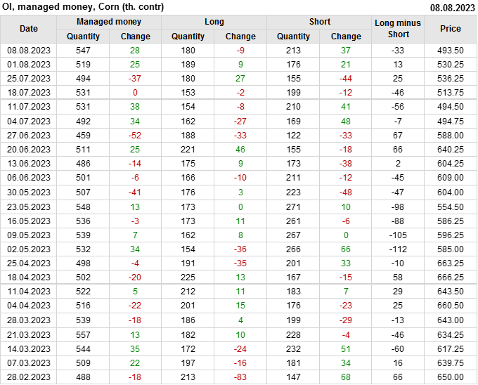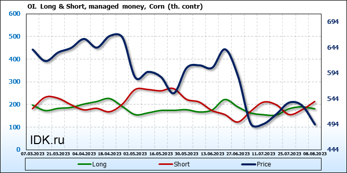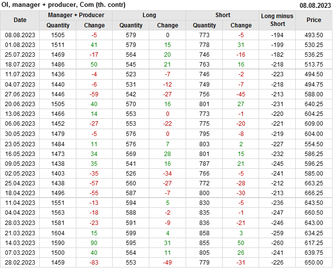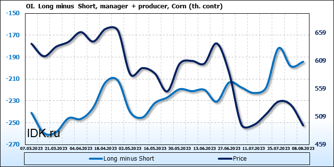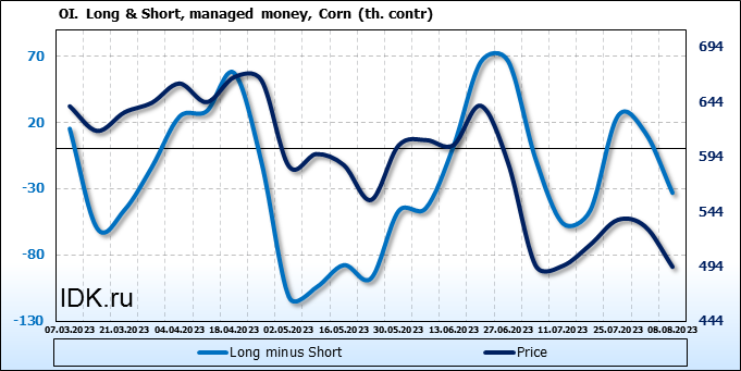 За прошлую неделю, 02.08.23 — 08.08.23, разница между длинными и короткими позициями управляющих увеличилась на 45.7 тыс. контрактов. В тоже время, цена упала на 36.75 цента.