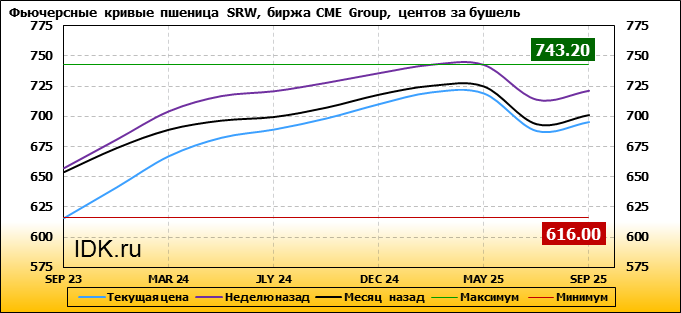 На 14.08.2023 стоимость пшеницы SRW на бирже CME Group по контракту SEP 23 составила 616 центов за бушель. За прошедшую неделю стоимость пшеницы SRW упала на 41.4 цента/бушель. Как мы видим на графике, фьючерсная кривая имеет периоды, когда более дальний фьючерс дешевле ближнего. Состояние бэквардации наблюдаем на следующих контрактах: MAY 25; JLY 25. Таким образом, трейдеры предполагают, что возможно превалирование предложения над спросом в указанные периоды.