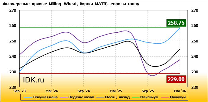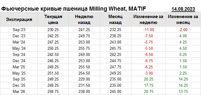 На 14.08.2023 стоимость пшеницы Milling Wheat на бирже MATIF по контракту Sep ’23 составила 230.25 евро за тонну. За прошедшую неделю стоимость пшеницы Milling Wheat упала на 11 евро/тонна. Как мы видим на графике, фьючерсная кривая имеет периоды, когда более дальний фьючерс дешевле ближнего. Состояние бэквардации наблюдаем на следующих контрактах: Sep ’24; Sep ’25. Таким образом, трейдеры предполагают, что возможно превалирование предложения над спросом в указанные периоды.