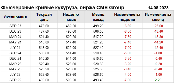 На 14.08.2023 стоимость кукурузы на бирже CME Group по контракту SEP 23 составила 475.6 цента за бушель. За прошедшую неделю стоимость кукурузы на площадке CME Group упала на 6.6 цента/бушель. Как мы видим на графике, фьючерсная кривая имеет периоды, когда более дальний фьючерс дешевле ближнего. Состояние бэквардации наблюдаем на следующих контрактах: SEP 24; SEP 25. Таким образом, трейдеры предполагают, что возможно превалирование предложения над спросом в указанные периоды.