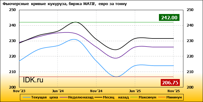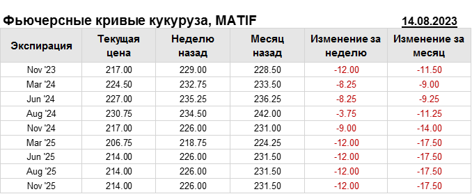 На 14.08.2023 стоимость кукурузы на бирже MATIF по контракту Nov ’23 составила 217 евро за тонну. За прошедшую неделю стоимость кукурузы на европейской площадке упала на 12 евро/тонна. Как мы видим на графике, фьючерсная кривая имеет периоды, когда более дальний фьючерс дешевле ближнего. Состояние бэквардации наблюдаем на следующих контрактах: Nov ’24; Mar ’25. Таким образом, трейдеры предполагают, что возможно превалирование предложения над спросом в указанные периоды.