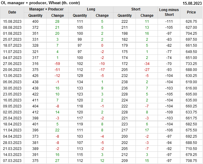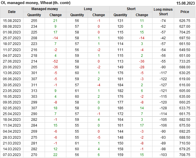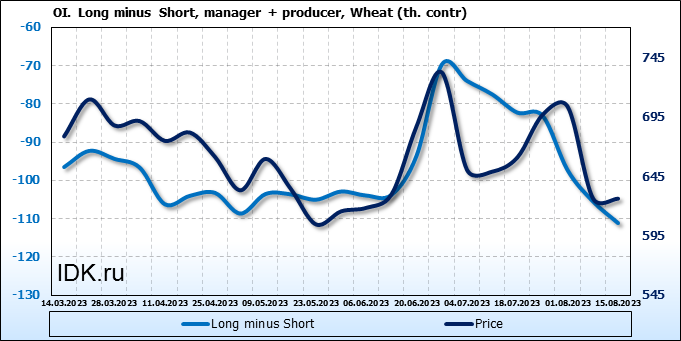 За прошедшую неделю, 09.08.23 — 15.08.23, разница между длинными и короткими позициями управляющих увеличилась на 12.3 тыс. контрактов. В тоже время, цена упала на 0.25 цента.