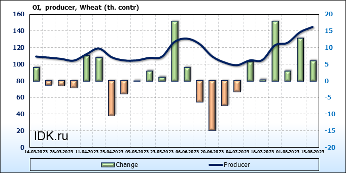 Открытый интерес производителей вырос на 6 тыс. контрактов. Объем контрактов, направленных на хеджирование, составляет 144 957 штук. Деньги производителей в течение прошлой недели приходили на рынок поддерживая тенденцию.