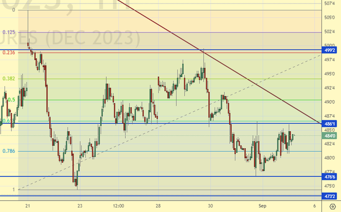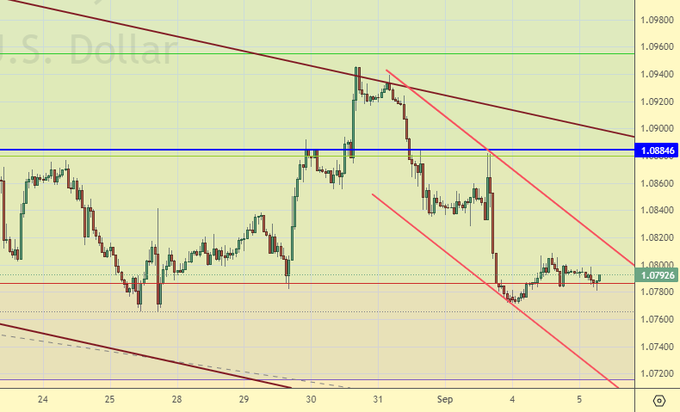 Ничего хорошего для рубля в данной картинке нет. Тут возможны были бы продажи, будь мы на каком-то обычном рынке, который не подвергается санкциям. В нашем же случае надежда на укрепление национальной валюты есть, но она крайне мала. Не помогают даже ожидания повышения ставки ЦБ РФ 15-го сентября.