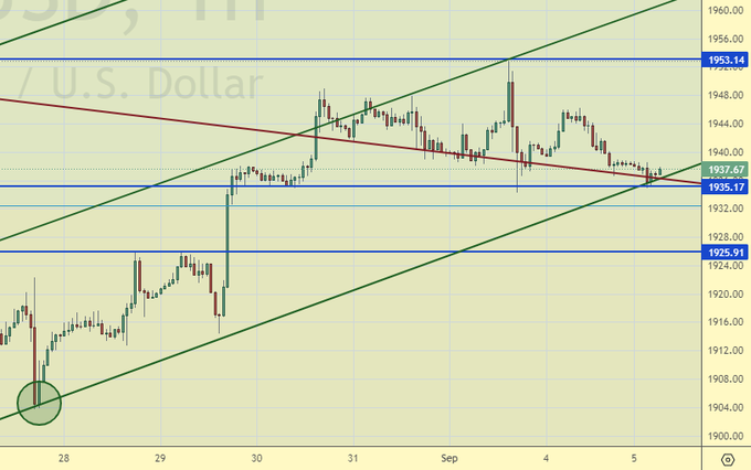 Так как вчера в США был выходной, торги носили вялый характер. Быкам всё также надо пробиваться выше 1950 для того, чтобы пресечь все попытки продавцов вернуться под 1900. На данный момент покупатели имеют небольшое преимущество, которое может быть утрачено в случае продолжения усиления позиций доллара.
