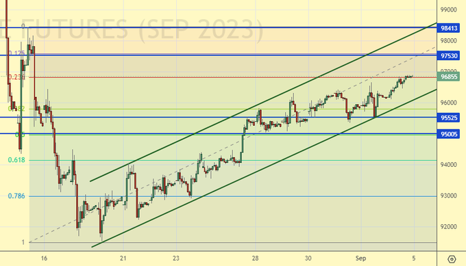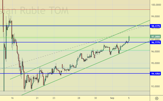 Продажа: если час закроется ниже 96.10. Стоп: 97.10. Цель: 87.00.