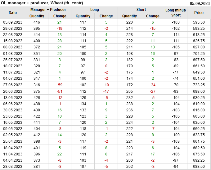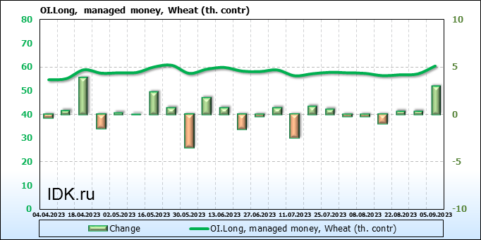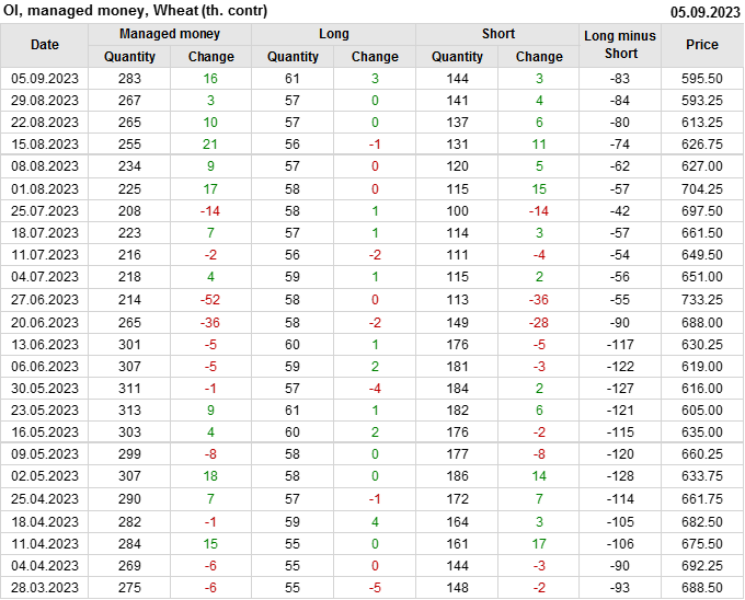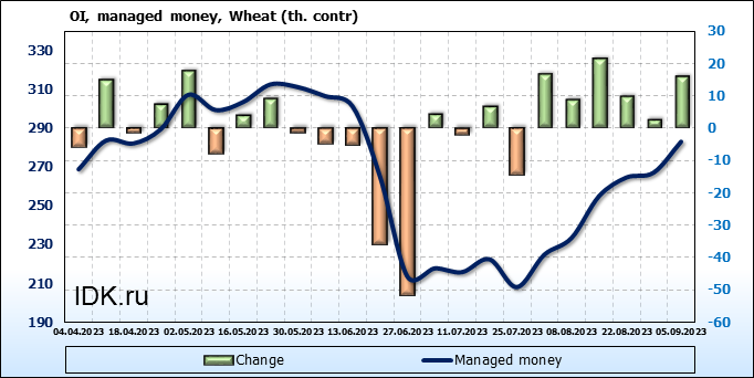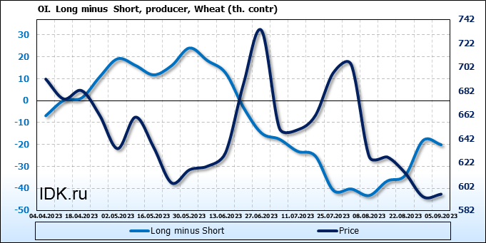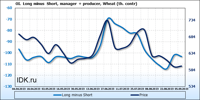За прошедшую неделю, 30.08.23 — 05.09.23, разница между длинными и короткими позициями управляющих сократилась на 0.7 тыс. контрактов. В тоже время, цена выросла на 2.25 цента.