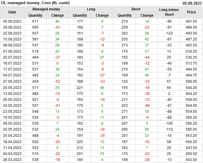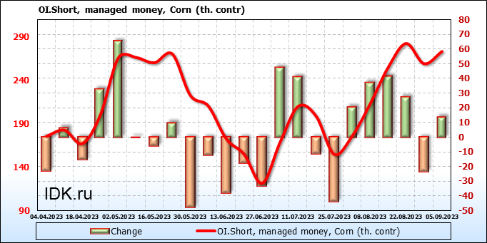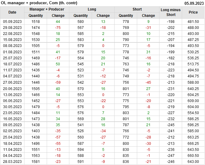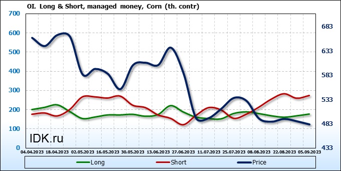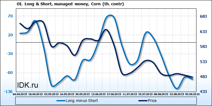 За прошлую неделю, 30.08.23 — 05.09.23, разница между длинными и короткими позициями управляющих увеличилась на 5.1 тыс. контрактов. В тоже время, цена упала на 6.5 цента.