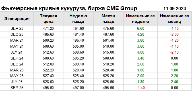 На 11.09.2023 стоимость кукурузы на бирже CME Group по контракту SEP 23 составила 471.2 цента за бушель. За прошедшую неделю стоимость кукурузы на площадке CME Group выросла на 6.6 цента/бушель. Как мы видим на графике, фьючерсная кривая имеет периоды, когда более дальний фьючерс дешевле ближнего. Состояние бэквардации наблюдаем на следующих контрактах: SEP 24; SEP 25. Таким образом, трейдеры предполагают, что возможно превалирование предложения над спросом в указанные периоды.
