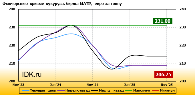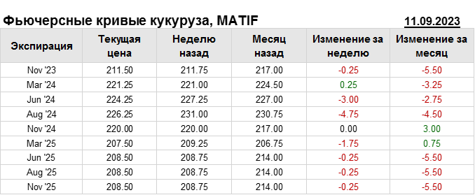 На 11.09.2023 стоимость кукурузы на бирже MATIF по контракту Nov ’23 составила 211.5 евро за тонну. За прошедшую неделю стоимость кукурузы на европейской площадке упала на 0.25 евро/тонна. Как мы видим на графике, фьючерсная кривая имеет периоды, когда более дальний фьючерс дешевле ближнего. Состояние бэквардации наблюдаем на следующих контрактах: Nov ’24; Mar ’25. Таким образом, трейдеры предполагают, что возможно превалирование предложения над спросом в указанные периоды.
