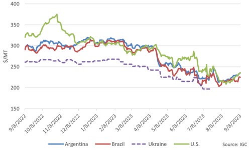 После августовского отчета WASDE предложения всех основных экспортеров выросли. Предложения в США составили 236 долларов за тонну, что на 19 долларов больше, чем в прошлом месяце. Низкий уровень воды в речной системе Миссисипи влияет на стоимость фрахта барж, поддерживая рост экспортных цен в США. Предложения Бразилии составили 225 долларов за тонну, что на 10 долларов больше, чем в прошлом месяце. Высокий спрос на поставки из Бразилии, о чем свидетельствуют крупные поставки в Китай, поддерживает рост цен. Предложения Аргентины составили 235 долларов за тонну, что на 19 долларов больше, чем в прошлом месяце. После завершения сбора урожая 2022/23 года цены во многом отражают глобальные настроения. Украинские предложения не публиковались с 21 июля.