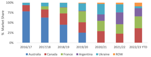 Мировое производство ячменя прогнозируется на уровне 141,9 миллиона тонн, что на 6,5 процента ниже, чем в предыдущем году, и является самым низким уровнем с 2018/19 года. Прогнозируется, что основные мировые производители и экспортеры ячменя, включая Европейский Союз, Россию и Канаду, снизят производство в 2023/24 году. Хотя производство ячменя в Австралии также прогнозируется ниже, экспорт по-прежнему прогнозируется на уровне 5,5 миллионов тонн из-за больших запасов после трех лет рекордных урожаев. Отменив пошлины, Китай получает доступ к столь необходимым поставкам ячменя из Австралии в год сокращения мировых экспортных поставок. Недавнее увеличение заявок на поставки ячменя в Австралию подтверждает идею о смене Китая поставщиком.