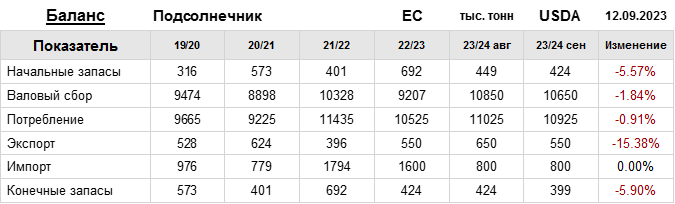 За прошедший месяц министерство сельского хозяйства США (USDA) на 12.09.2023 пересмотрело Баланс подсолнечника для ЕС в сезоне 23/24 следующим образом: