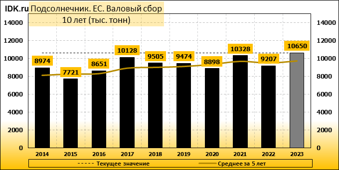 Валовый сбор: оценка пересмотрена в сторону понижения до 10650 тысяч тонн. Показатель упал на -1.84 процента.