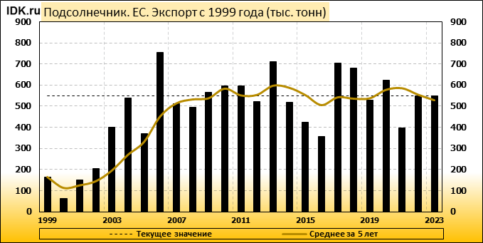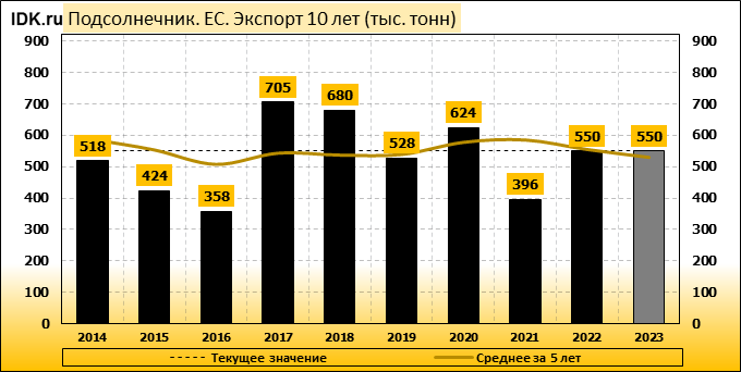Экспорт: оценивается в 550 тысяч тонн. За месяц показатель упал на -15.38 процента.