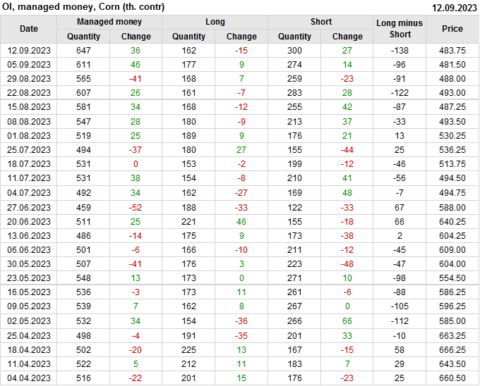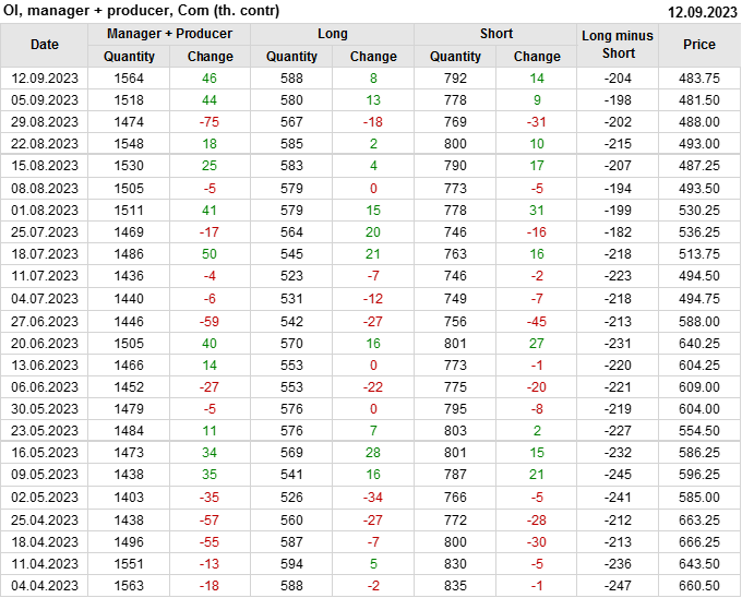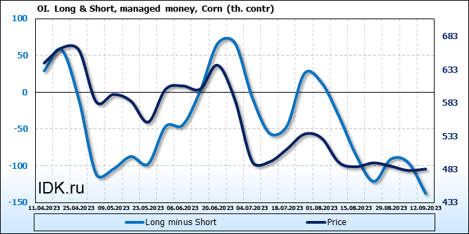 За прошлую неделю, 06.09.23 — 12.09.23, разница между длинными и короткими позициями управляющих увеличилась на 42 тыс. контрактов. В тоже время, цена выросла на 2.25 цента.