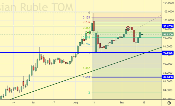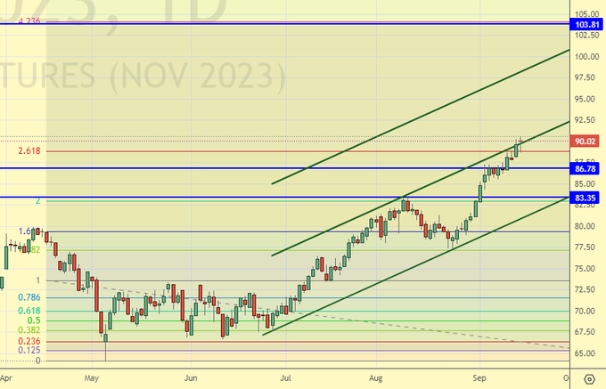 Сценарий роста: рассматриваем ноябрьский фьючерс, дата экспирации 20 октября. Если мы закрепимся выше 90.00, то пойдем на 103.80. Тем не менее, покупать будем только на откате.