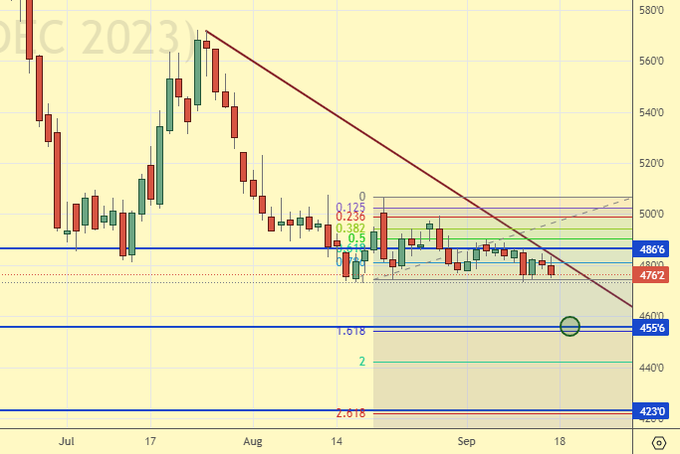 Сценарий роста: рассматриваем декабрьский фьючерс, дата экспирации 14 декабря. Вошли в лонг от 570.0. Теперь держим лонги в расчете на то, что мы зацепили минимум сезона. Не исключаем хода на 550.0. От данного уровня надо будет покупать еще агрессивнее.
