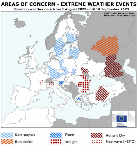 После наводнений в Словении, о которых сообщалось в августовском выпуске Бюллетеня, количество осадков, значительно превышающее средний уровень, при этом максимальное суточное количество осадков в некоторых районах превышало 100 мм, привело к дополнительному затоплению полей с уже насыщенной почвой. Беспрецедентные наводнения в Греции (Фессалии, на которую приходится 22% национального производства зерновой кукурузы) привели к полной гибели яровых посевов.
