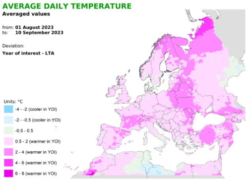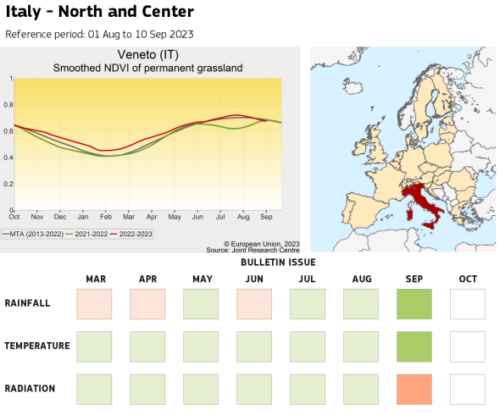 Отчетливые волны тепла, затронувшие регионы на северо-востоке Франции (особенно в Рона-Альпах) около 23 августа, оказали негативное влияние на перспективы производства зерновой кукурузы. На северо-западе Италии (Пьемонте, Ломбардия) в августе накопление биомассы на постоянных лугах замедлилось из-за аномально высоких среднесуточных и максимальных суточных температур, особенно в третьей декаде августа.