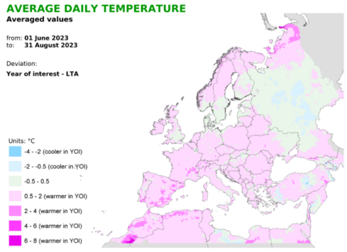 Лето характеризовалось более теплыми, чем обычно, погодными условиями на большей части территории Европы, с волнами тепла и во многих местах с рекордно высокими положительными аномалиями температуры. Количество осадков было выше среднего в большинстве регионов, но с большими колебаниями в пространстве и в течение сезона.