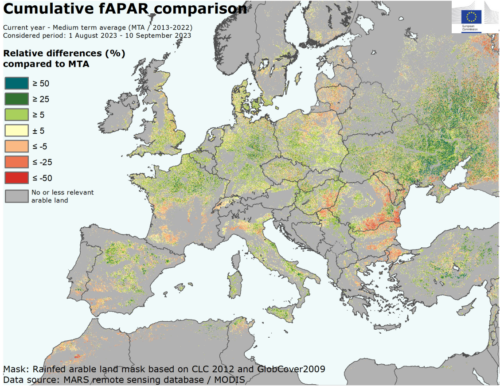 На карте отображена разница между долей поглощенной фотосинтетически активной радиации (fAPAR), накопленной с 1 августа по 10 сентября 2023 года, и среднесрочным средним значением (МТА, 2013-2022) за тот же период. Положительные аномалии (зеленый цвет) отражают плотность растительного покрова выше средней или раннее развитие сельскохозяйственных культур, тогда как отрицательные аномалии (красный цвет) отражают накопление биомассы ниже среднего или позднее развитие сельскохозяйственных культур.