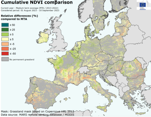 На карте ниже показаны различия между кумулятивным нормализованным разностным индексом растительности (NDVI) с 1 августа по 10 сентября 2023 года и MTA за тот же период на лугопастбищных территориях ЕС. Положительные аномалии (зеленый цвет) отражают зелень поверхности выше среднего, что связано с продуктивностью пастбищ выше среднего, а отрицательные аномалии (красный цвет) отражают зелень поверхности ниже среднего. Наблюдения за кормовыми культурами добавляются к соответствующим странам при их наличии.