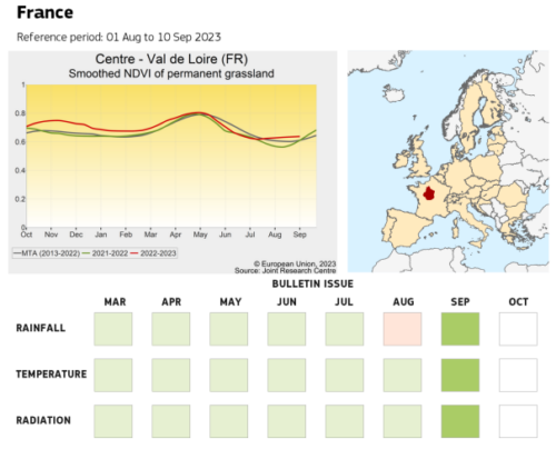 Во Франции накопление биомассы находится на среднем уровне, за исключением юго-востока (Лангедок-Руссильон, Рона-Альпы), где на рост отрицательно влияют сухие и жаркие условия, преобладавшие в июле и большей части августа, а также в первой декаде сентября. В странах Бенилюкса и северной Германии пастбища и кормовая кукуруза выиграли от осадков выше среднего в сочетании с солнечными днями и адекватными температурами с июля, что привело к накоплению биомассы выше среднего. Подобные условия наблюдались на юге Германии, но очень сильные осадки на юго-востоке и в альпийских предгорьях (например, в Баварии) могли вызвать локальный ущерб и затруднить доступ к пастбищам.