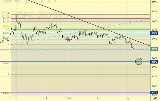 Видим новый минимум. Наши ожидания по кукурузе в целом оказались верными: мы пошли искать новый минимум. Нельзя исключать, что рынок сядет к 425.0. Покупки от 455.0 возможны, но напрямую рекомендовать их пока не будем.