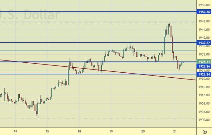 Если продавцы затолкают рынок под 1915, то это приведет к возобновлению падения золота. Несмотря на то, что вчера ставка в США повышена не была, комментарий председателя оказался жестким, что снижает перспективы роста на рынке золота. Облигации сейчас в приоритете.