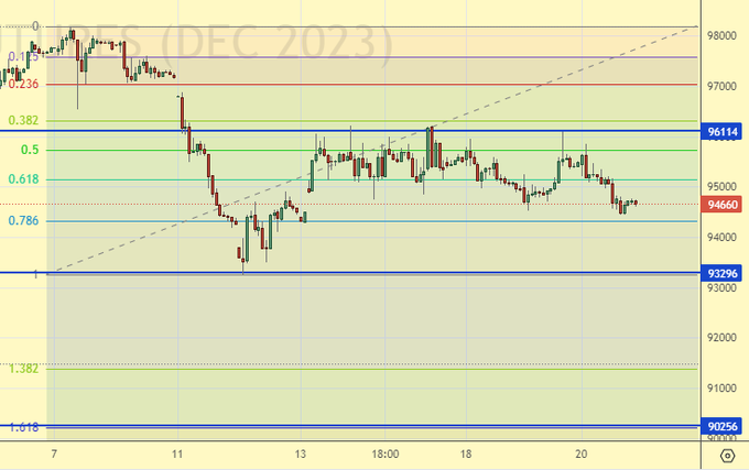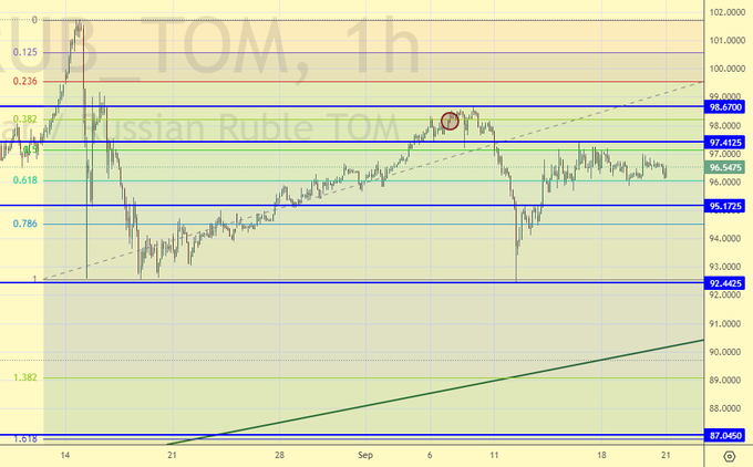 Пока мы в диапазоне. Если поклонники рубля что-то хотят показать нам, например, свою силу, то надо сегодня и завтра интенсивно распродавать доллар. Технически ситуация в пользу рубля, но она растает как дым в случае роста пары выше 98.00.
