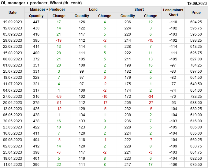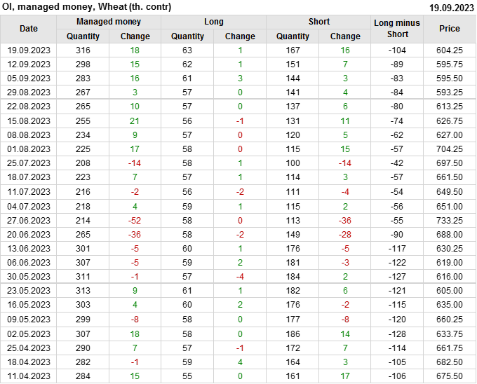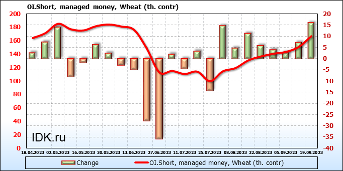 За прошедшую неделю, 13.09.23 — 19.09.23, разница между длинными и короткими позициями управляющих увеличилась на 14.7 тыс. контрактов. В тоже время, цена выросла на 8.5 цента.